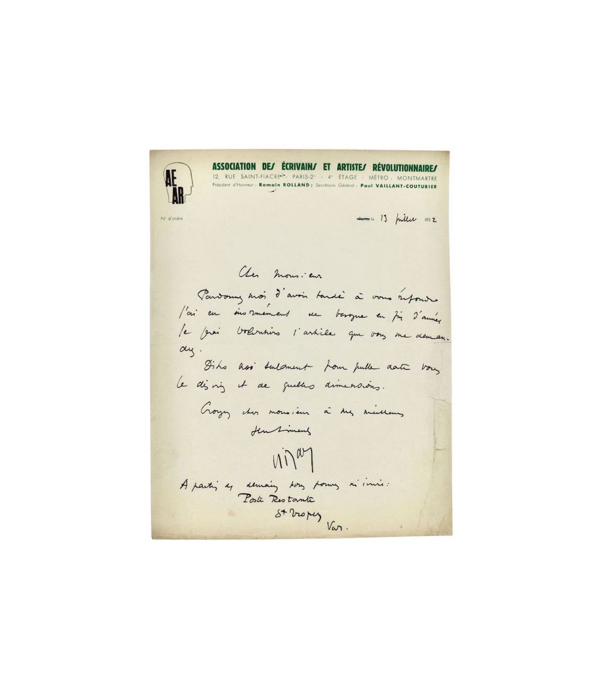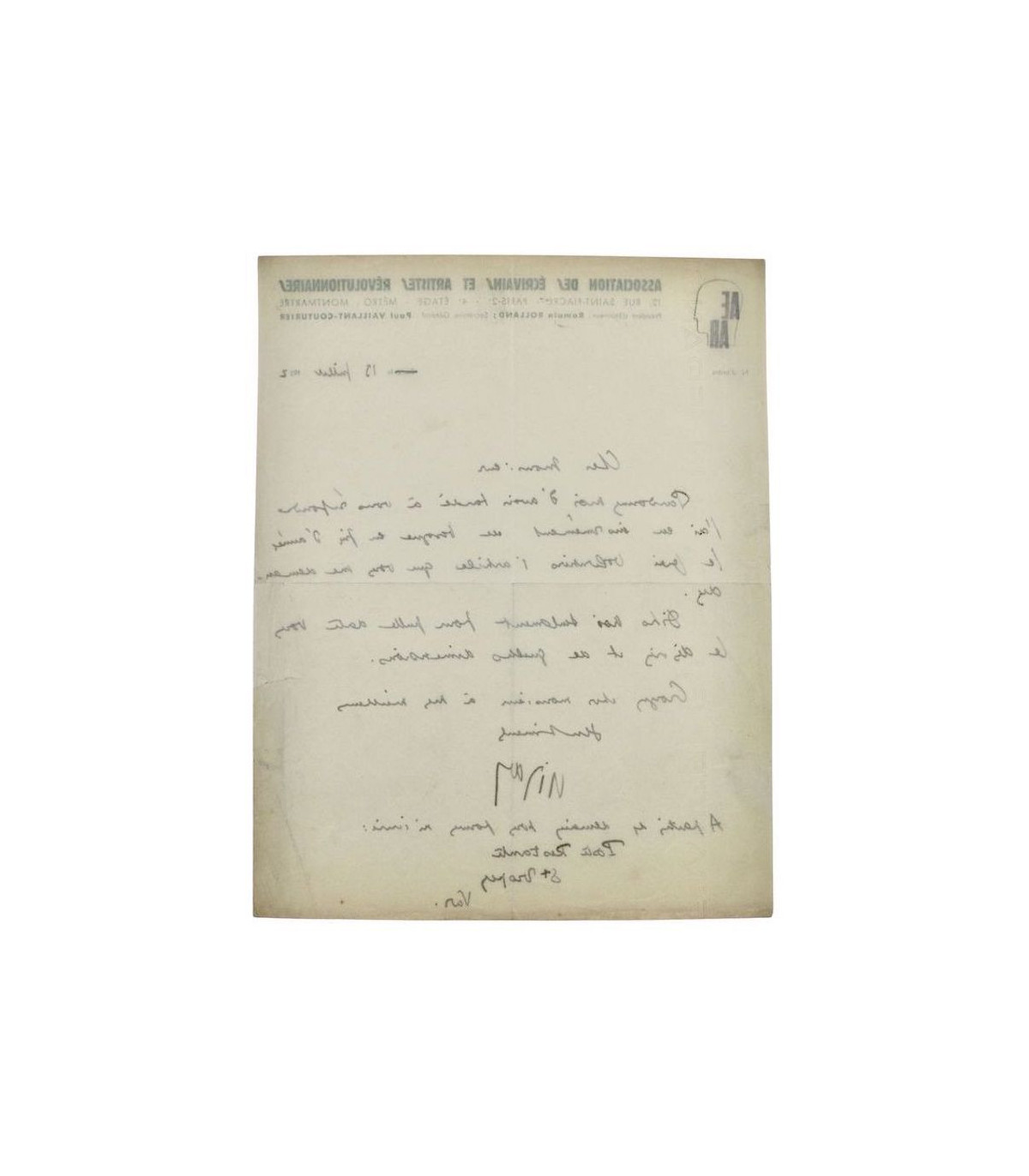 LETTRE AUTOGRAPHE SIGNÉE [Association des Écrivains et Artistes Révolutionnaires]