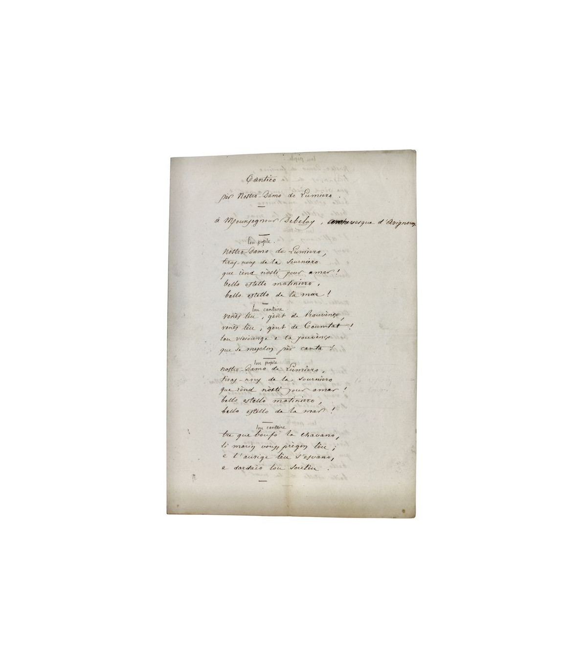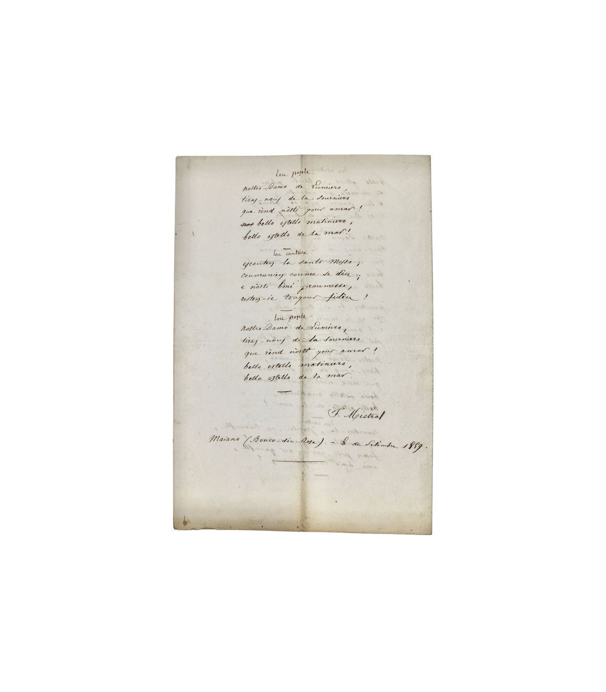 Manuscrit autographe signé « F. Mistral » — Cantico per Nosto-Damo de Lumiero (Cantique pour Notre-Dame de Lumière).