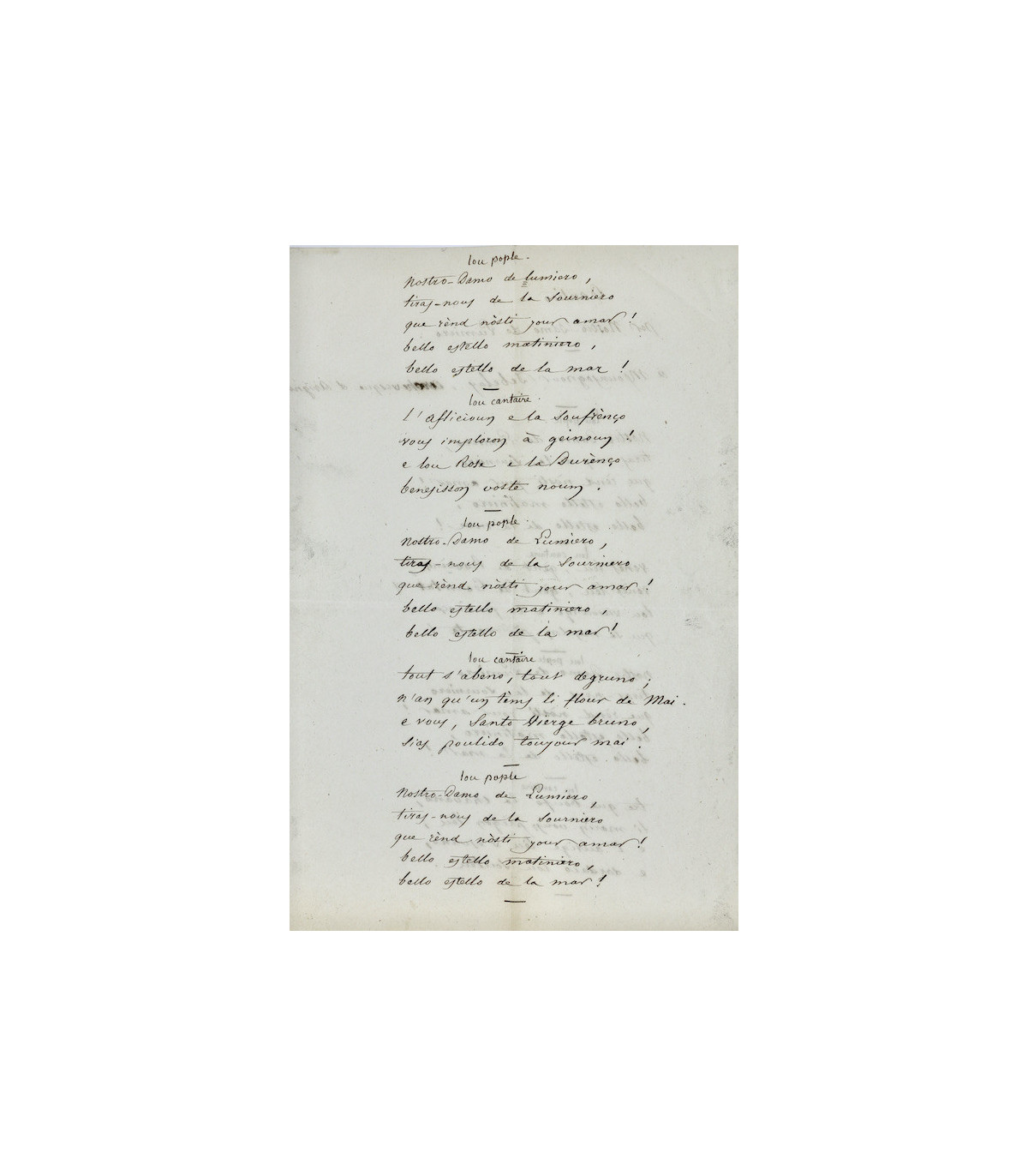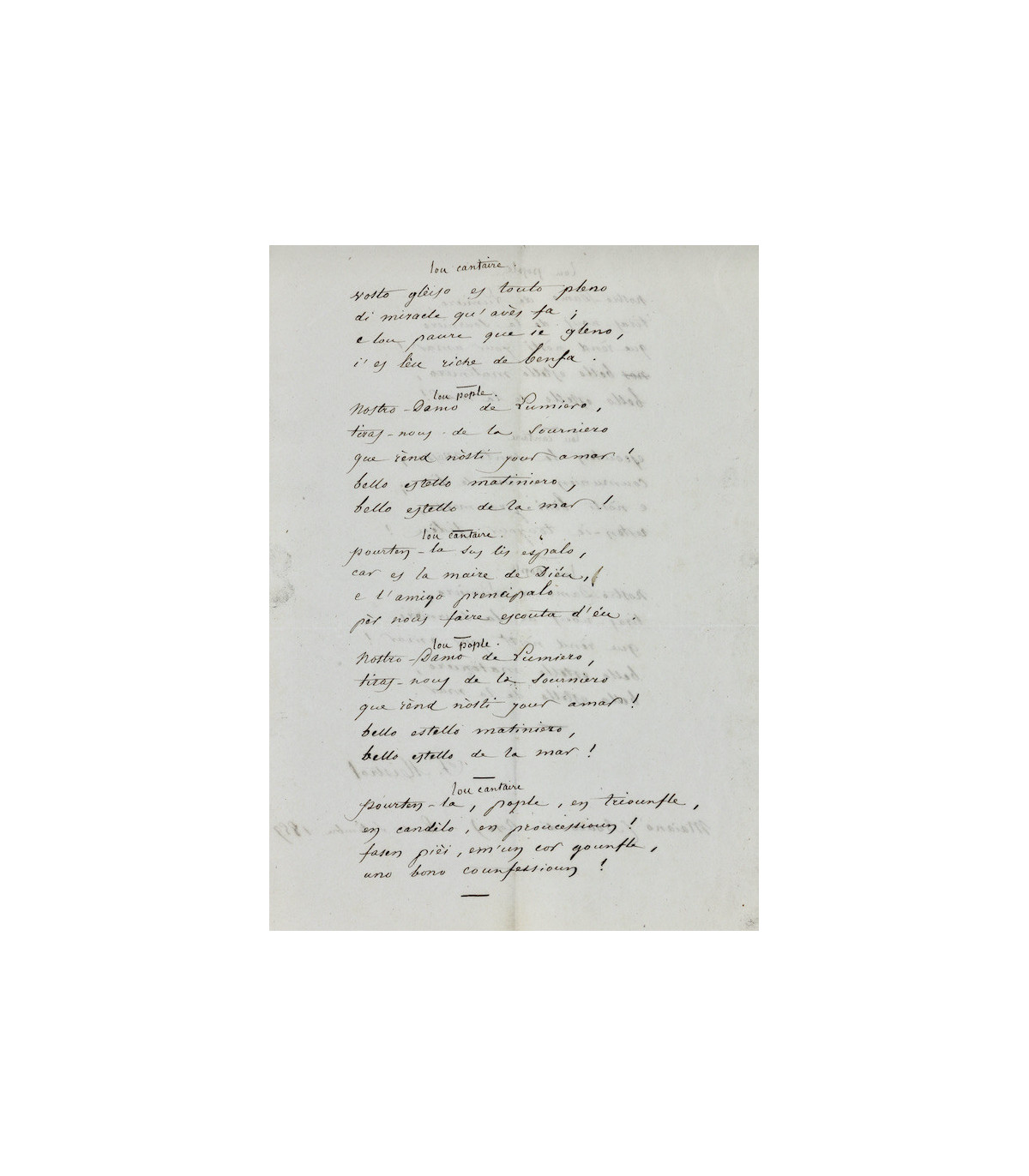 Cantique autographe alterné « lou pople » / « lou cantaire », avec refrain invoquant Notre-Dame de Lumière, « bello estello matiniéro, bello estello de la mar », vraisemblablement composé pour une célébration locale. Ce texte ne figure pas, à notre connaissance, dans les ouvrages publiés de Mistral.