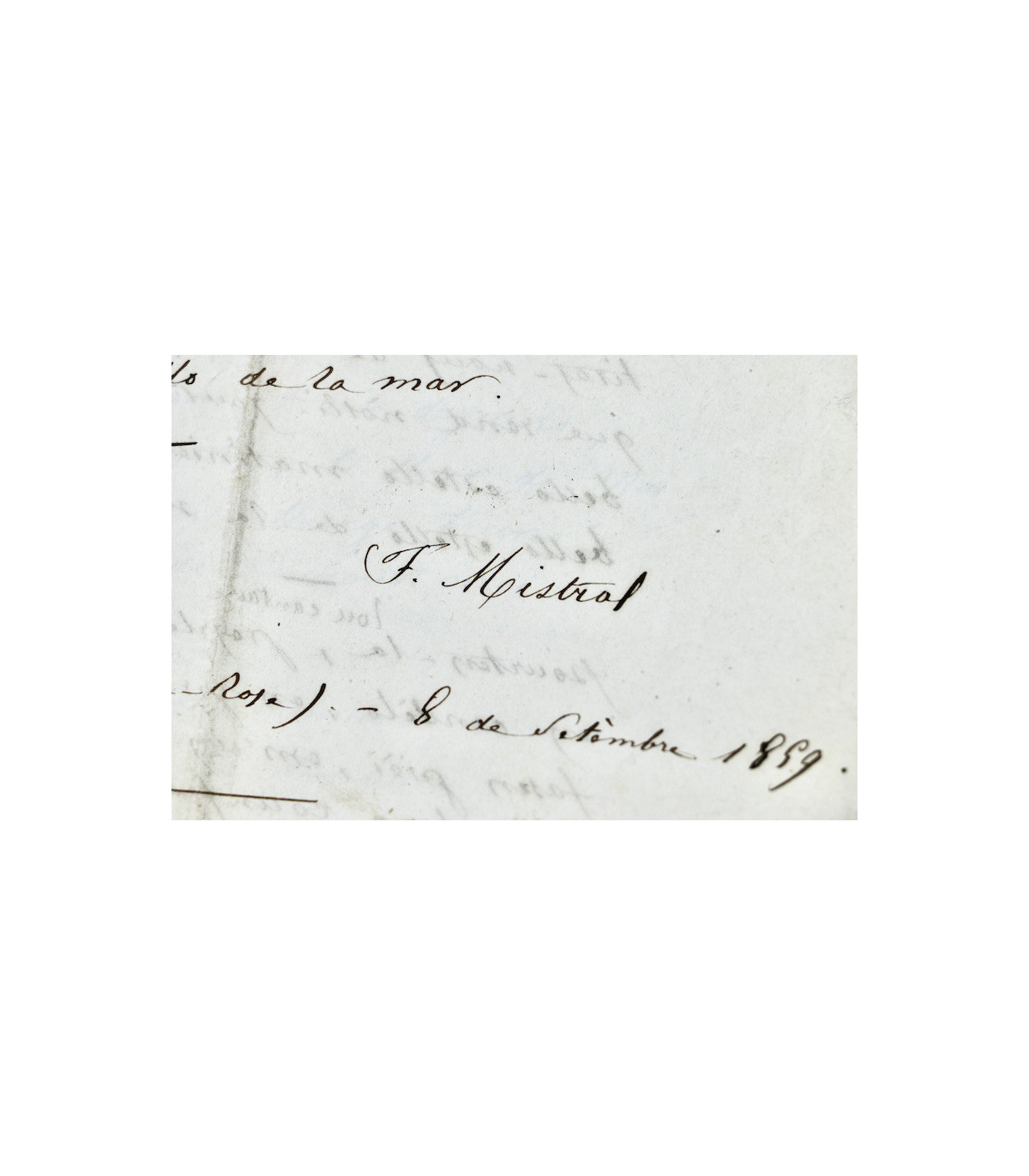 Dédicace autographe : « à Mounsignour Debelay, archevesque d’Avignoun ». Maiano (Bouco dóu Rose) [Maillane, Bouches-du-Rhône], 8 de Setèmbre 1859.