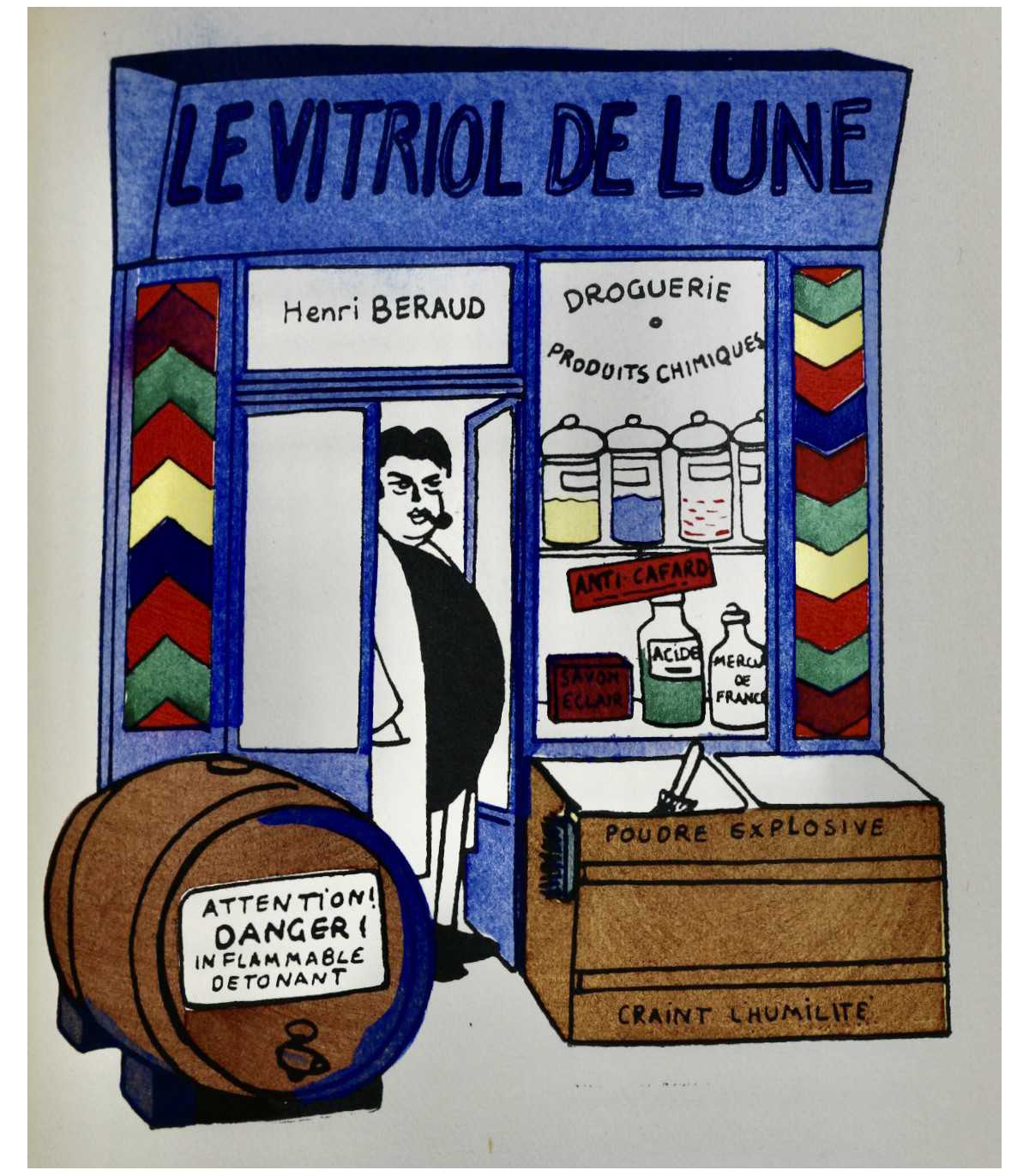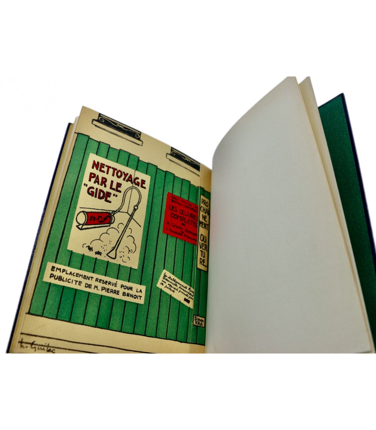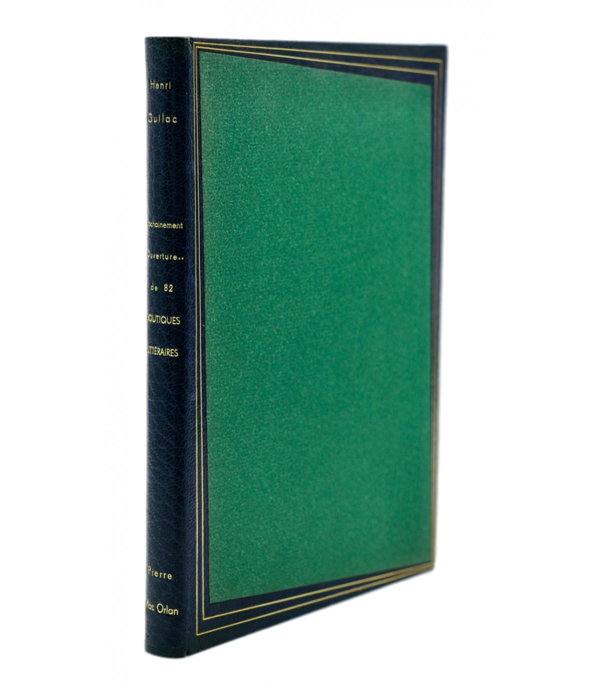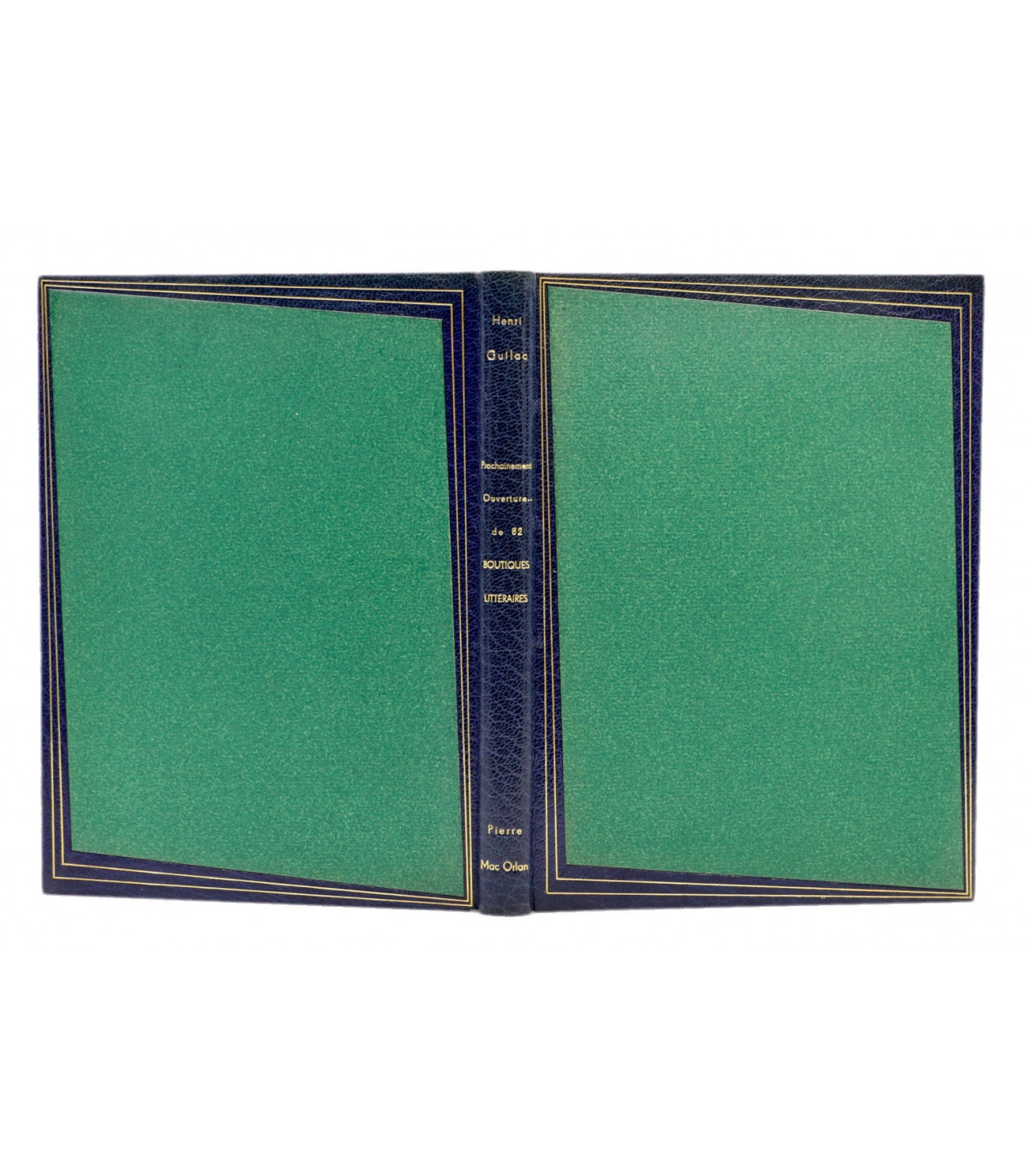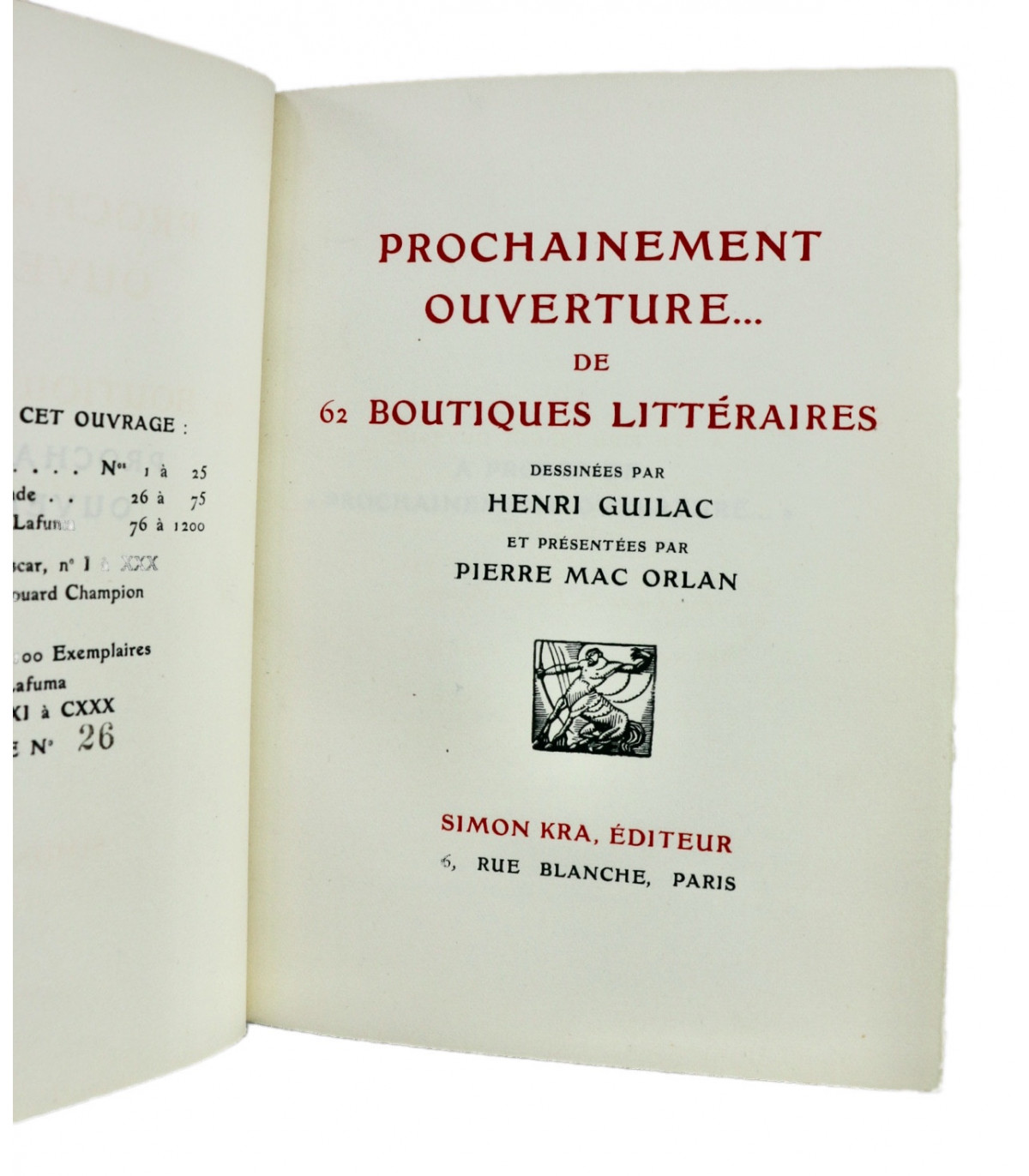 Édition originale illustrée de 62 planches en couleurs par Henri Guilac coloriées au pochoir (dont la couverture). Chaque composition représente un écrivain mis en scène dans sa boutique, dont l’enseigne porte le nom d’un de ses ouvrages. Un des 50 exemplaires numérotés sur Hollande, celui-ci n°26.