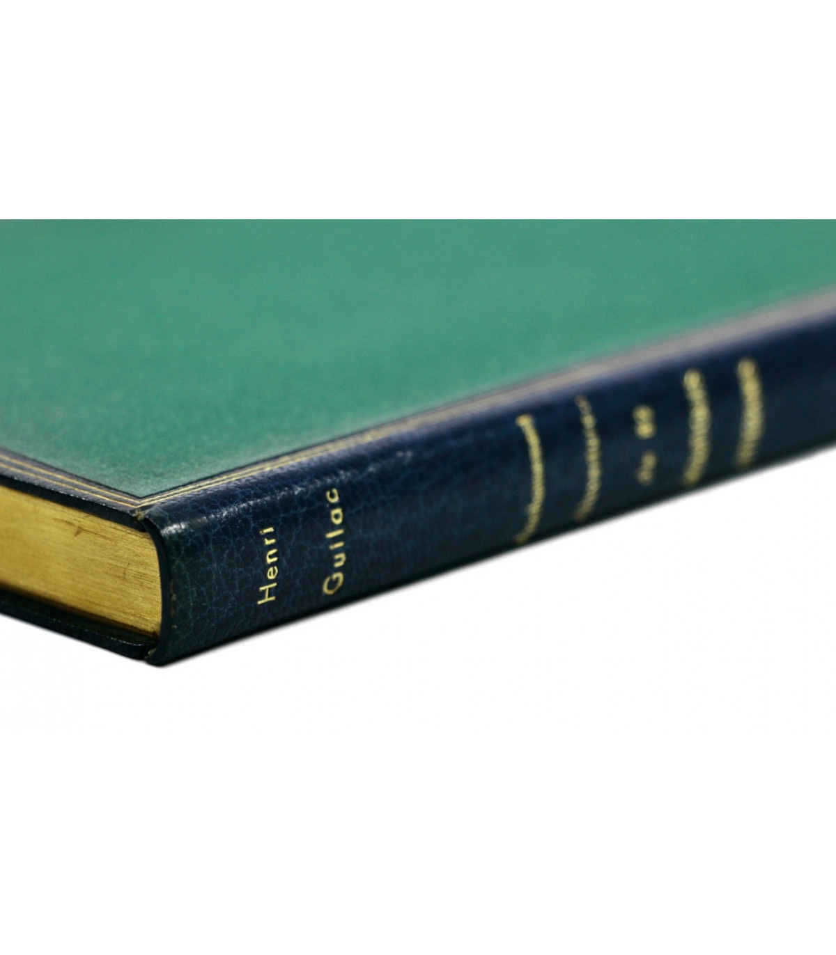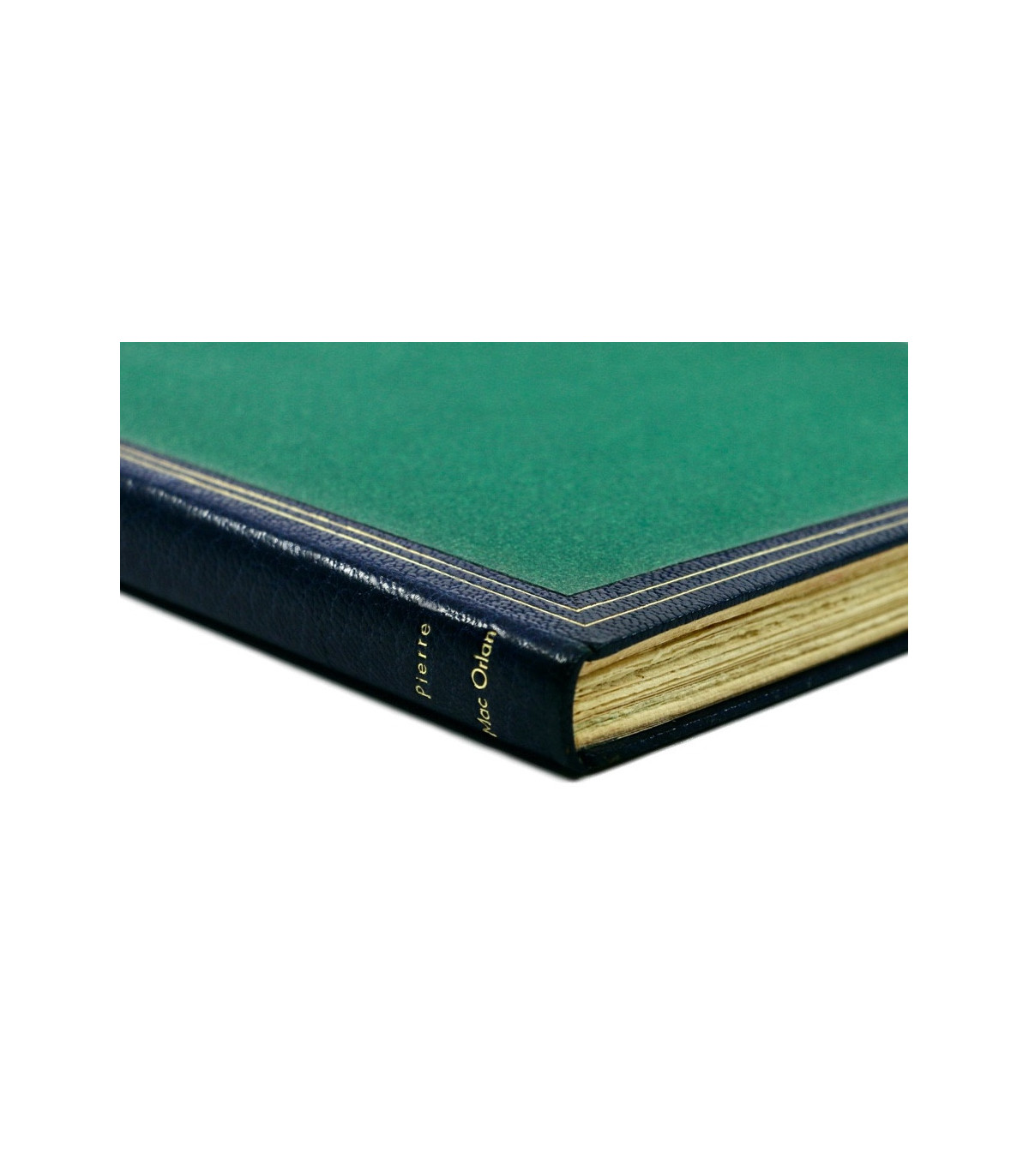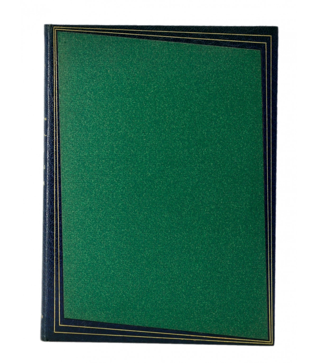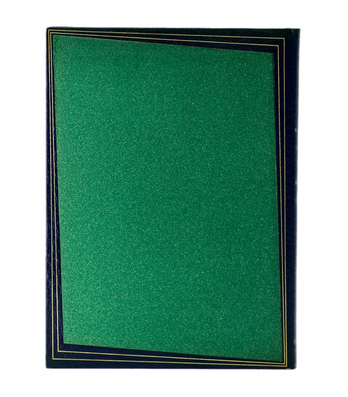 Plein maroquin bleu nuit, dos lisse orné du titre, de l’auteur et de l’illustrateur frappés or, plats décorés d’un double filet doré en encadrement d’un grand polygone de papier mat de couleur vert incrustés dans les plats, doublures et gardes de même papier, tête dorée, couvertures et dos conservés (P. L. Martin).