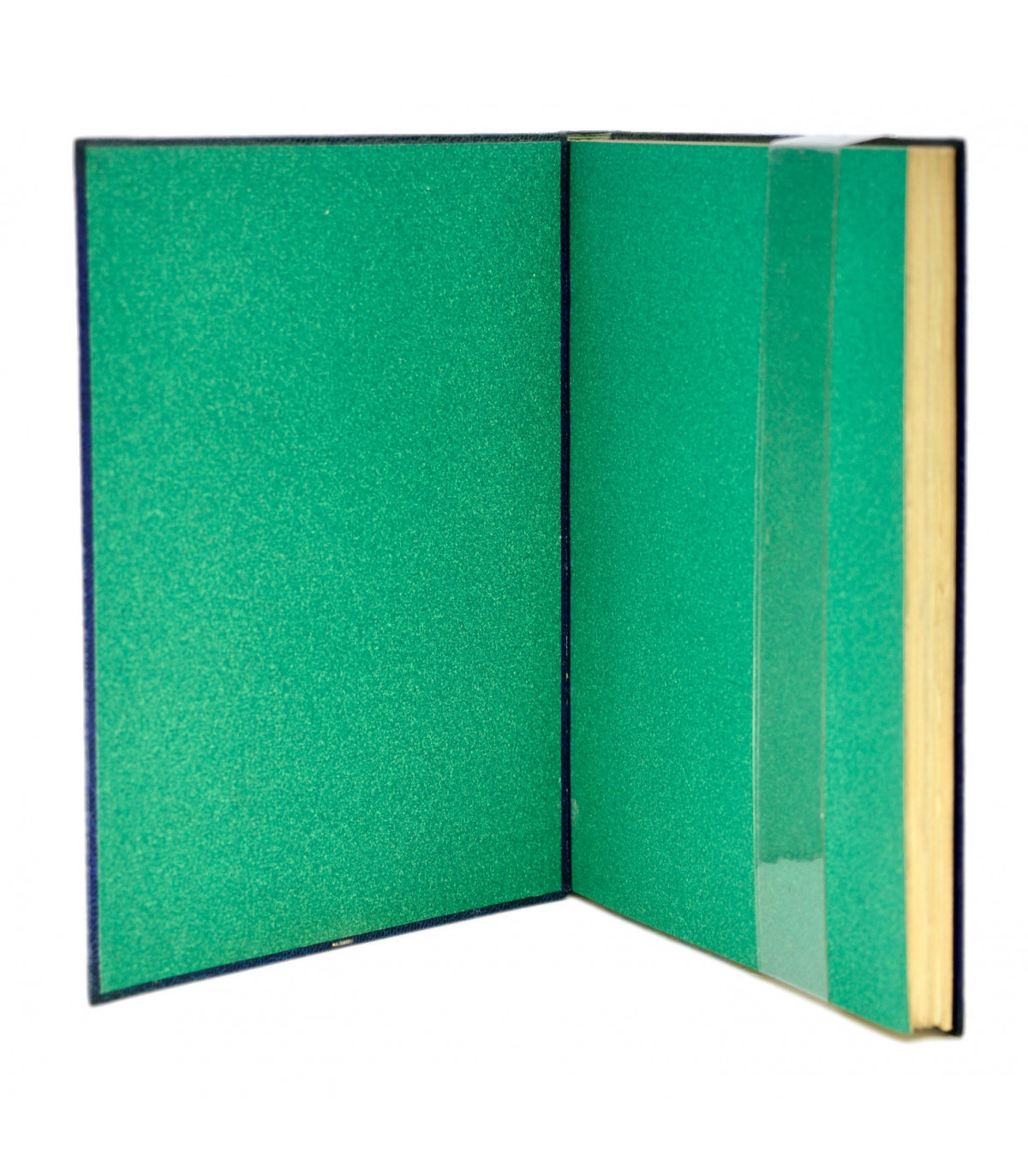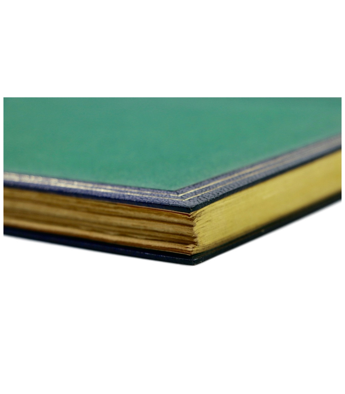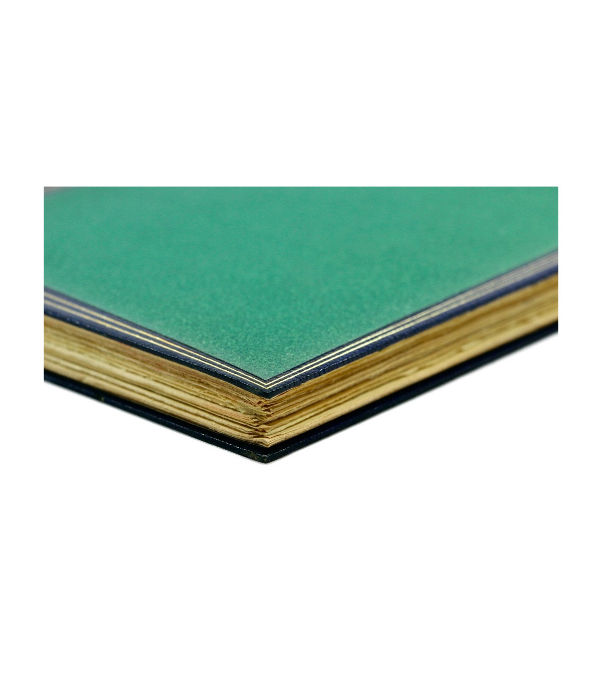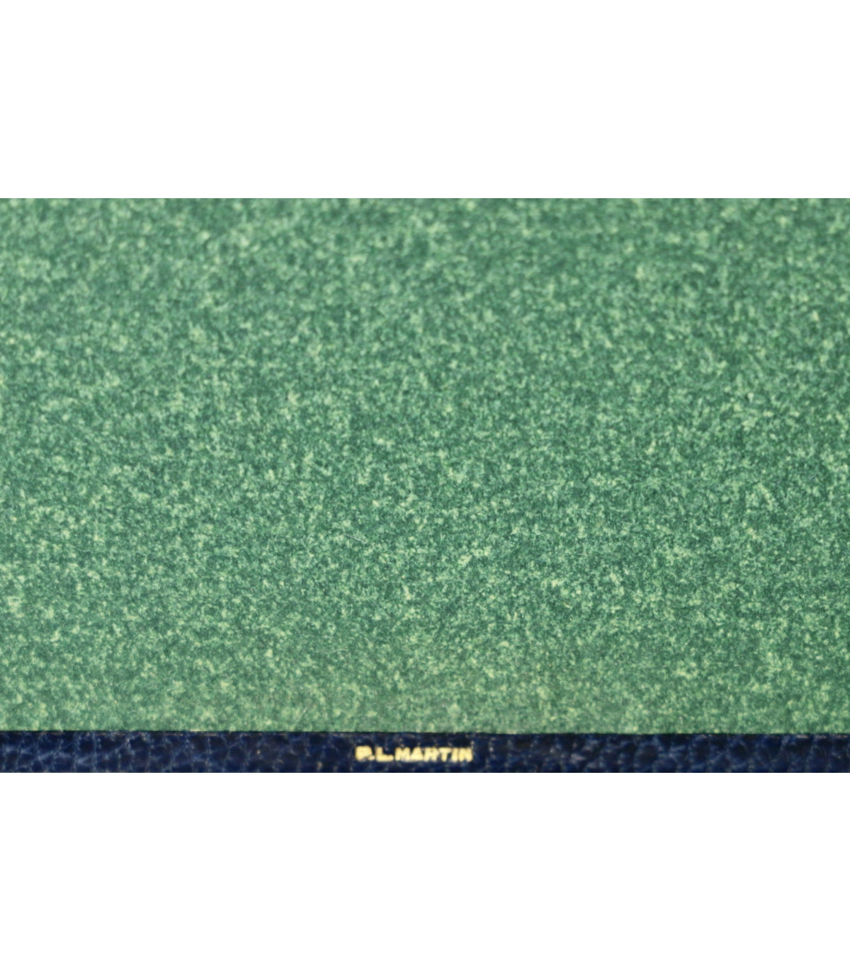 Plein maroquin bleu nuit, dos lisse orné du titre, de l’auteur et de l’illustrateur frappés or, plats décorés d’un double filet doré en encadrement d’un grand polygone de papier mat de couleur vert incrustés dans les plats, doublures et gardes de même papier, tête dorée, couvertures et dos conservés (P. L. Martin).