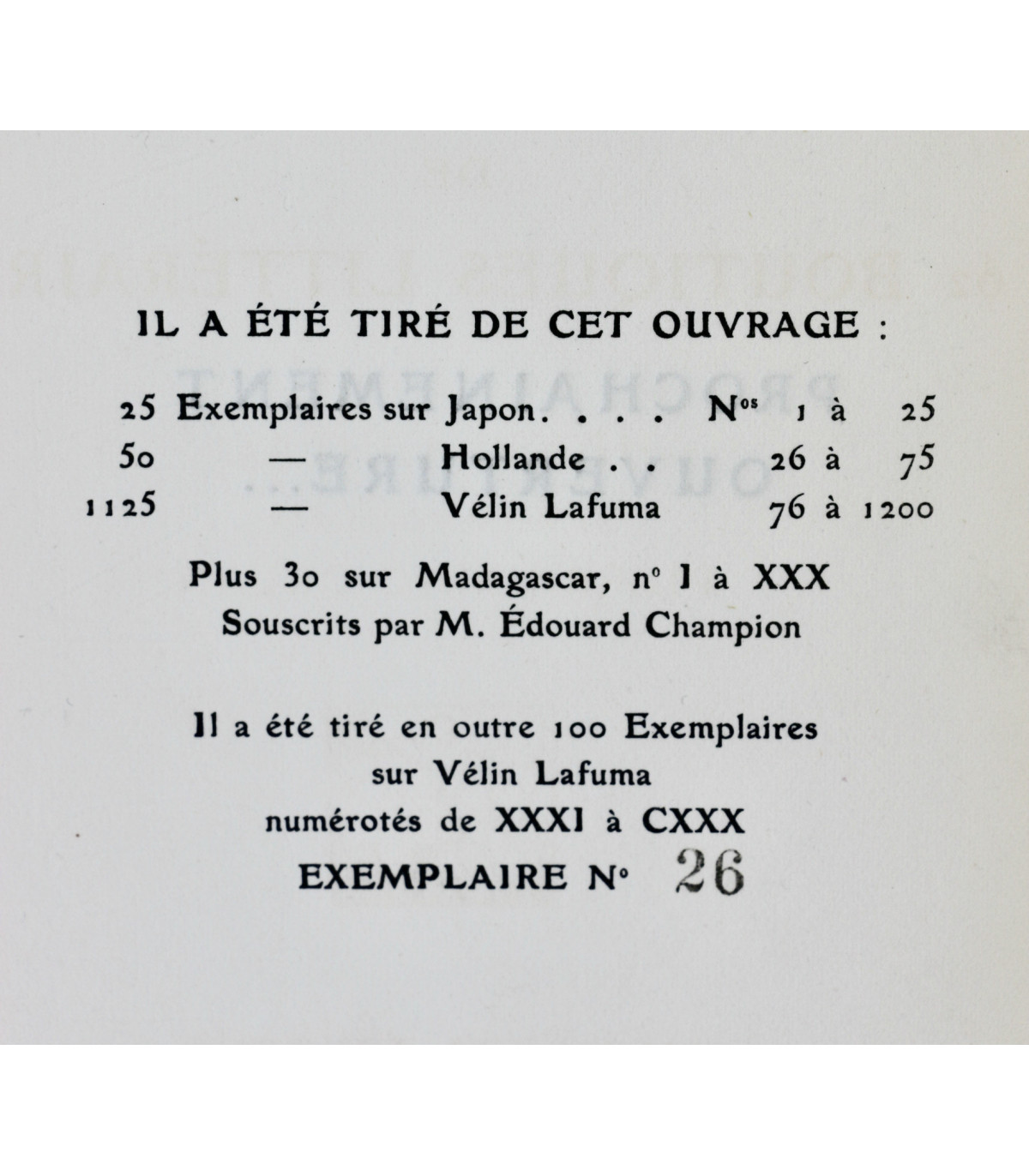 In-8 (19,7cm x 14,6cm) de 10pp.-[64]ff. Tirage à 1230 exemplaires numérotés, dont 25 exemplaires sur Japon, 50 exemplaires sur Hollande, 1125 exemplaires sur vélin Lafuma et 30 exemplaires sur Madagascar.